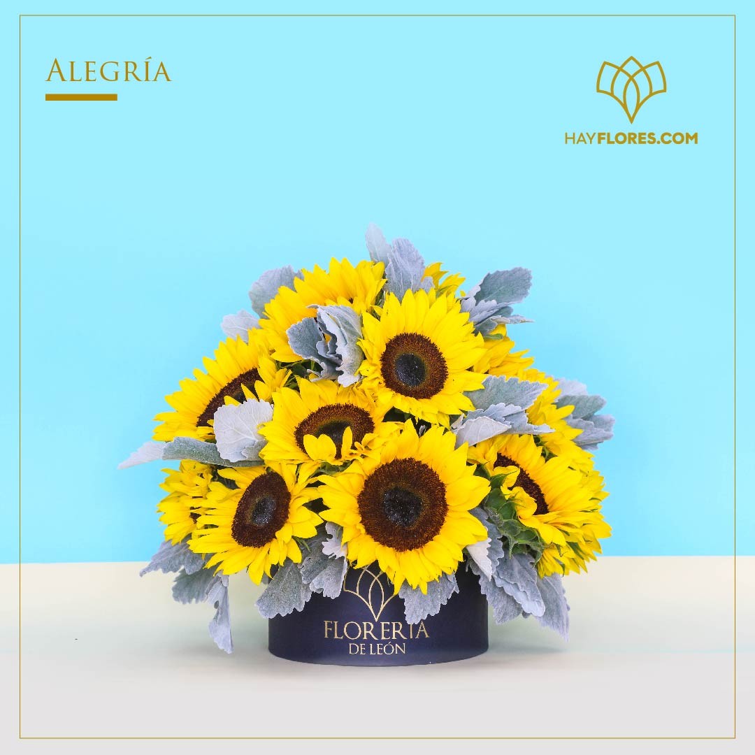 Distinguida caja redonda con 20 Girasoles y complementada con follajes finos.
