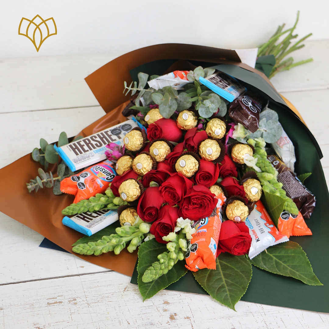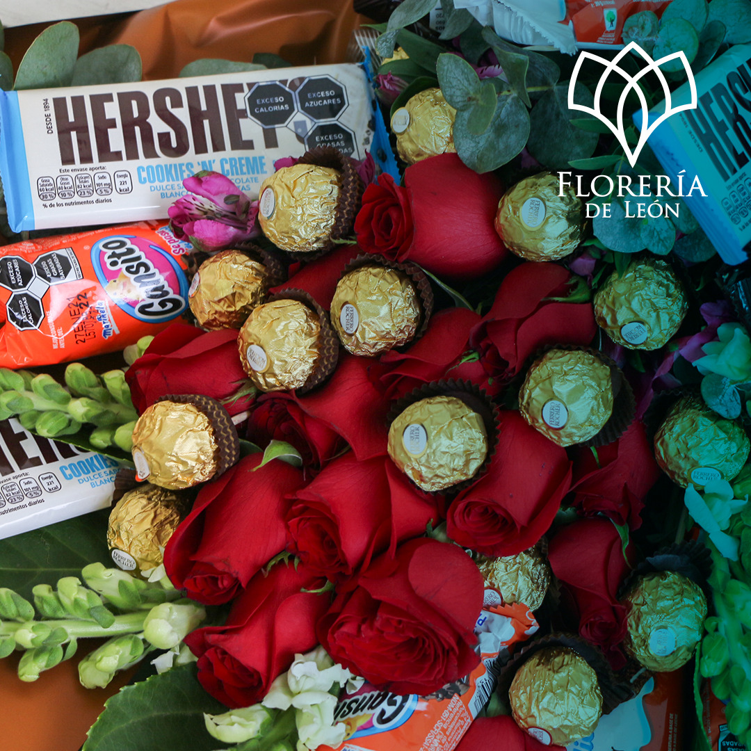 Bonito ramo de 16 rosas, 16 chocolates ferrero rocher y barras de chocolate variado.