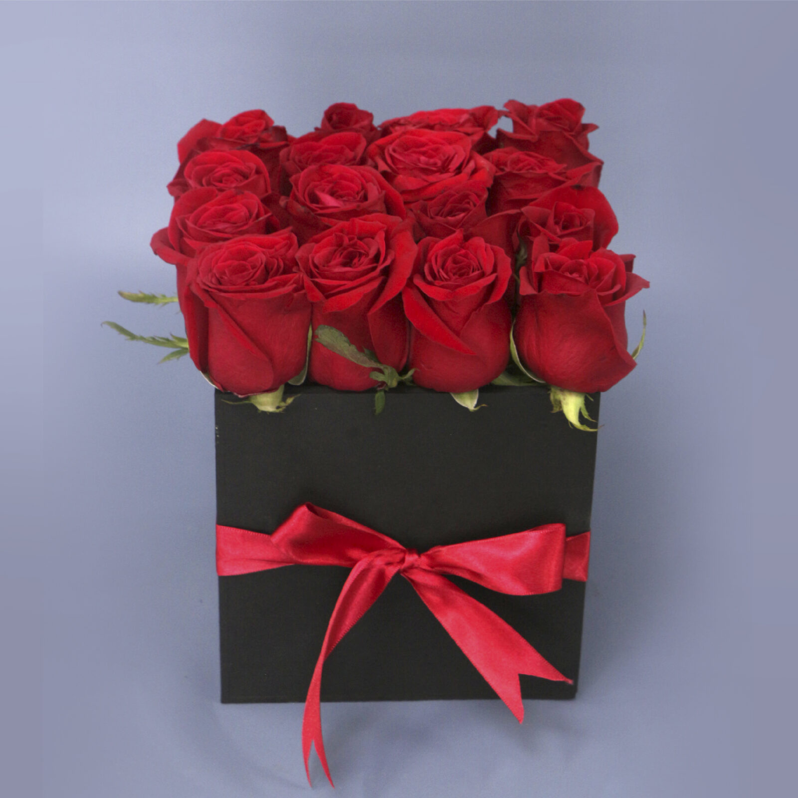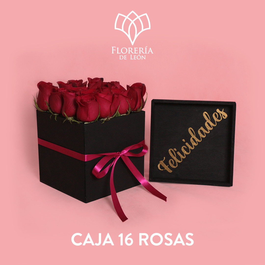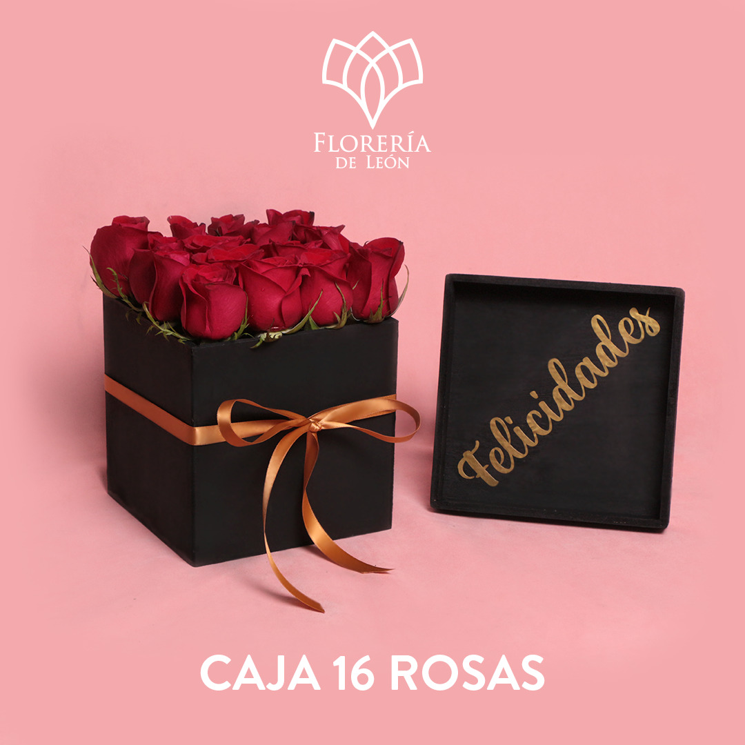 Distinguida caja con 16 Rosas rojas (La caja puede ser de color rojo, rosa, amarillo, azul)