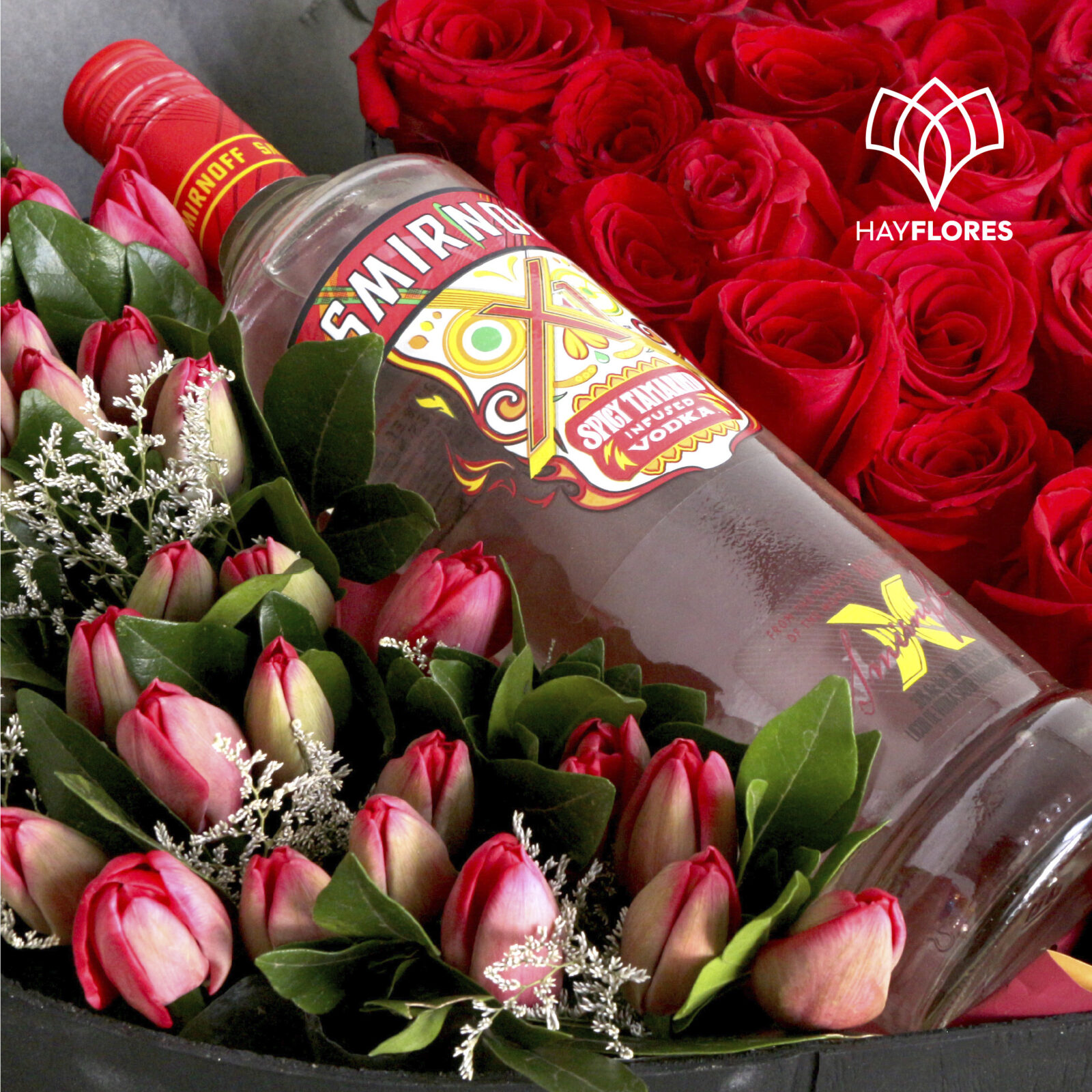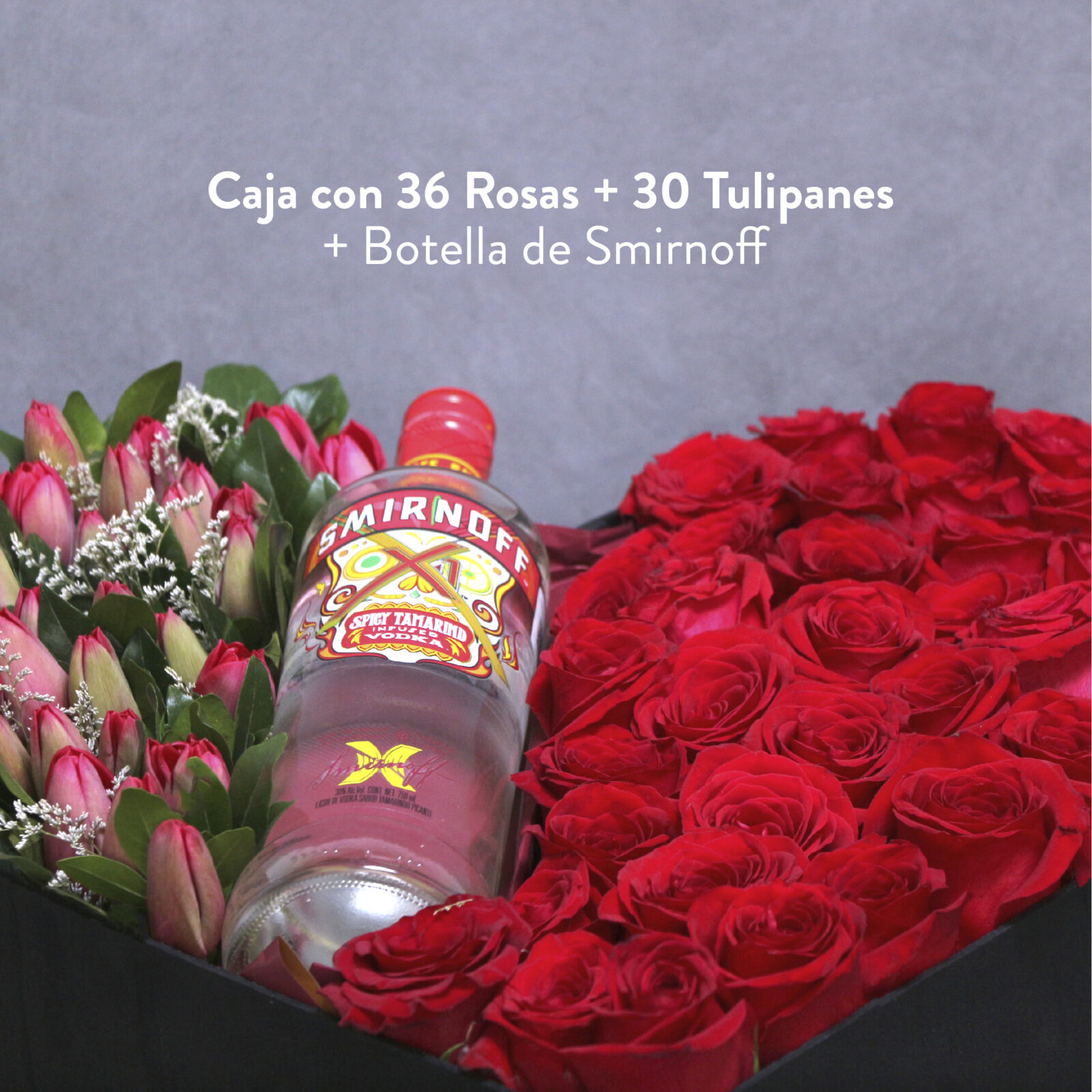 Distinguida caja en forma de corazón que contiene una botella de Smirnoff y el acompañamiento de 36 rosas con 30 tulipanes a los costados.
