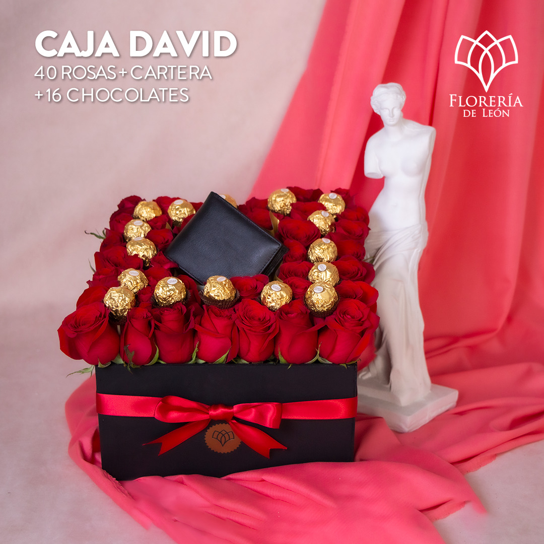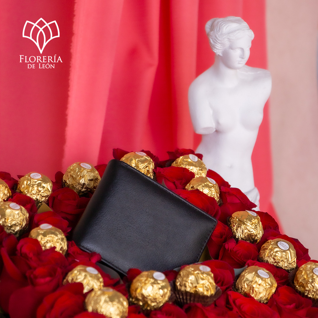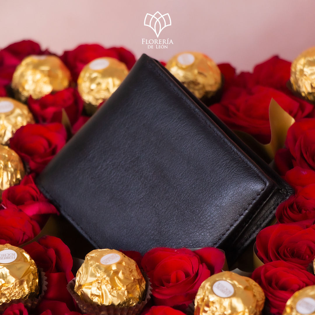 Elegante caja floral para hombre el cual contiene 40 rosas, cartera de piel y 16 chocolates Ferrero Rocher.