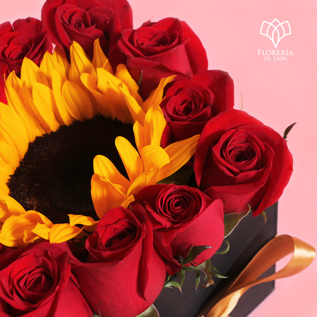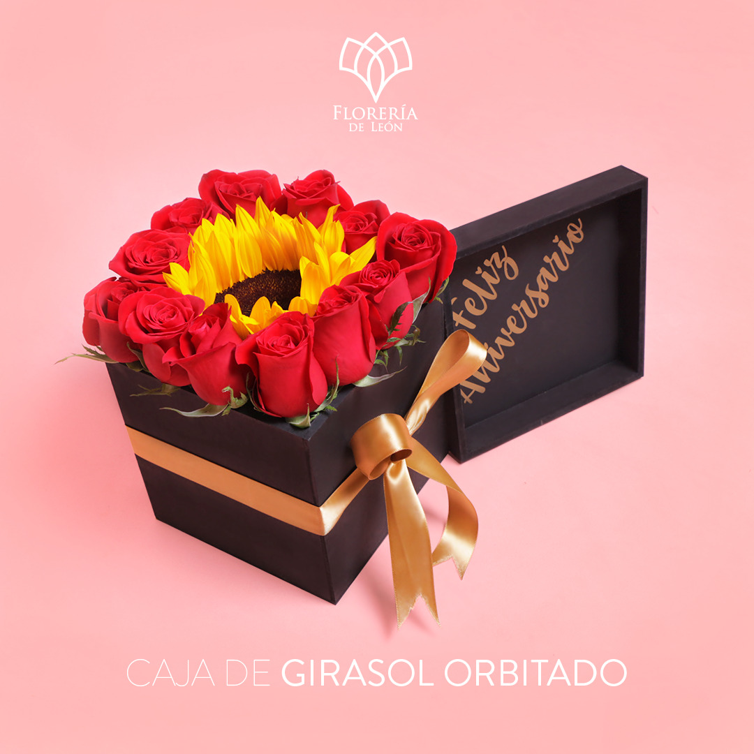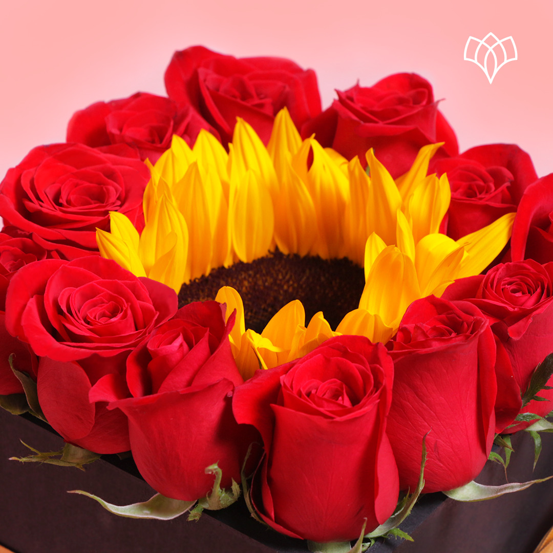 Hicimos lo excepcional. Casí imposible. Transportamos uno de nuestros arreglos más creativos dentro de una de nuestras distinguidas cajas de regalo. Hablamos del Girasol orbitado, simulando un sistema solar liderado por un girasol grande y rodeado por alrededor de 14 rosas rojas.