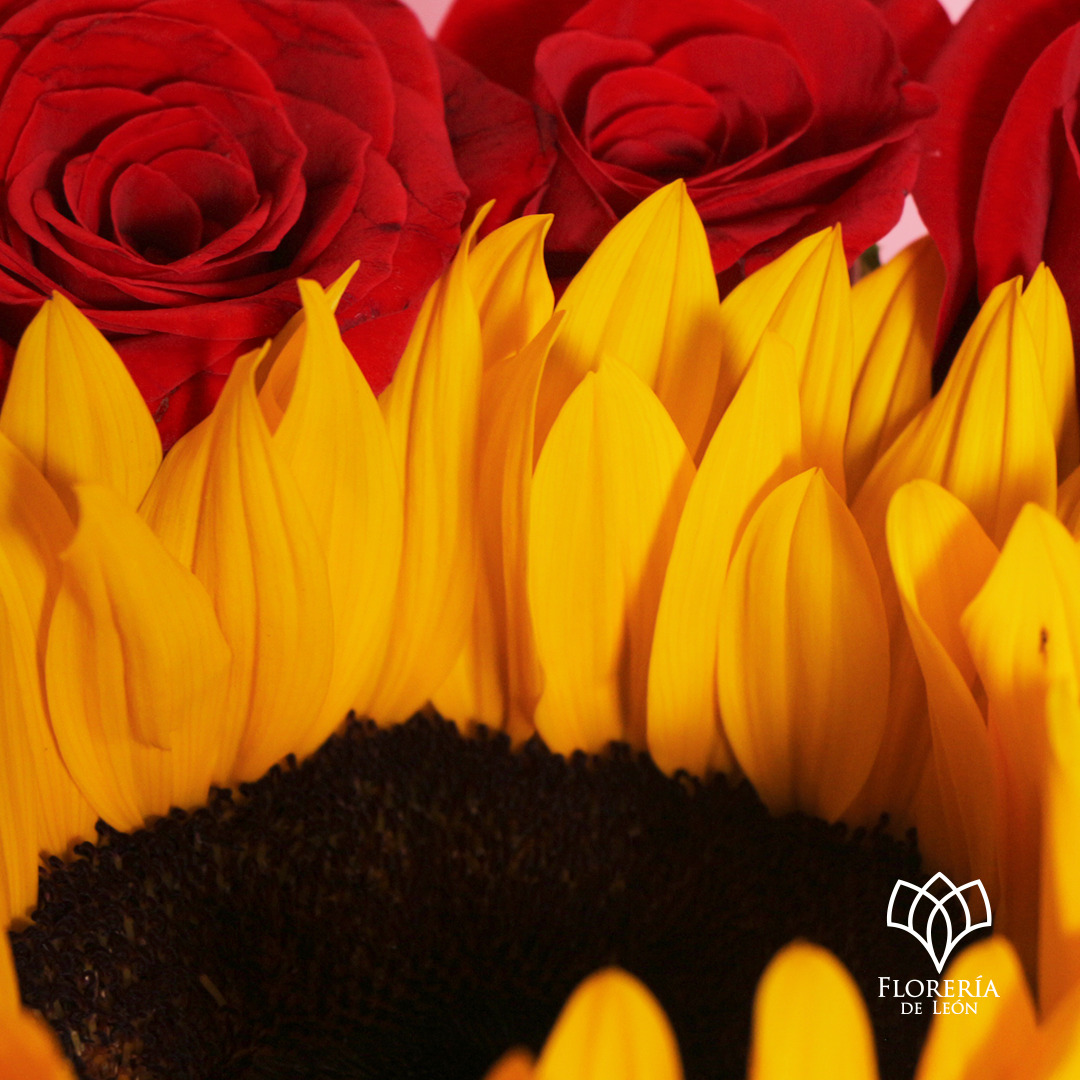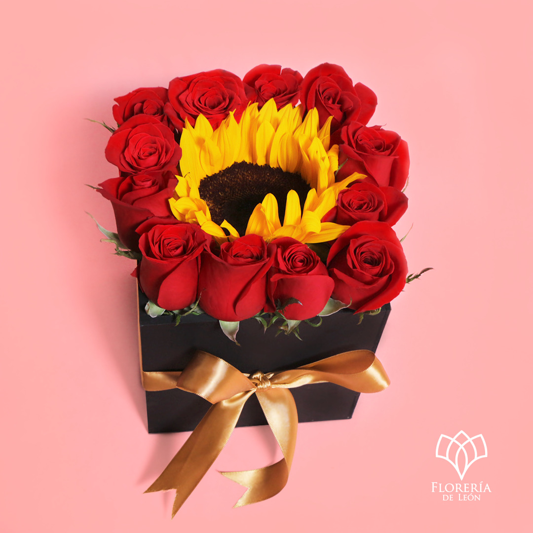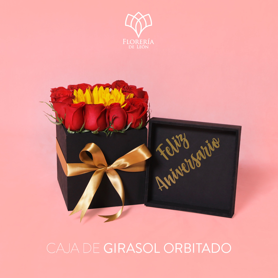Hicimos lo excepcional. Casí imposible. Transportamos uno de nuestros arreglos más creativos dentro de una de nuestras distinguidas cajas de regalo. Hablamos del Girasol orbitado, simulando un sistema solar liderado por un girasol grande y rodeado por alrededor de 14 rosas rojas.