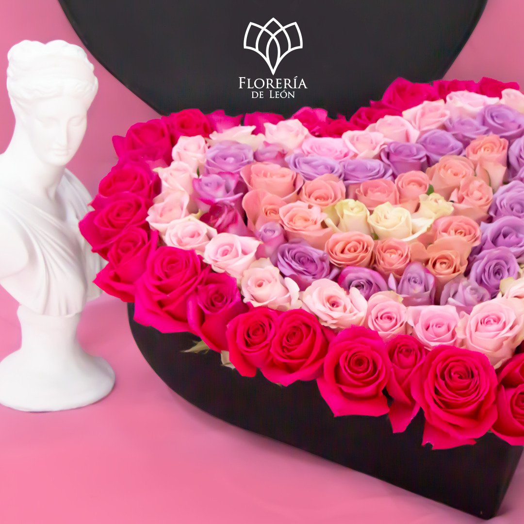 Bonita caja en forma de corazón con 90 rosas en tonos pastel: fucsia, rosa, palo de rosa, blanco y morado.