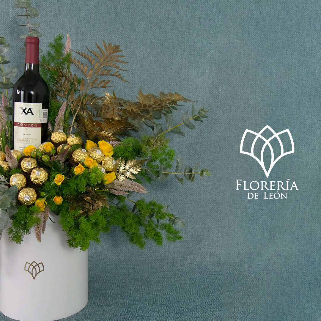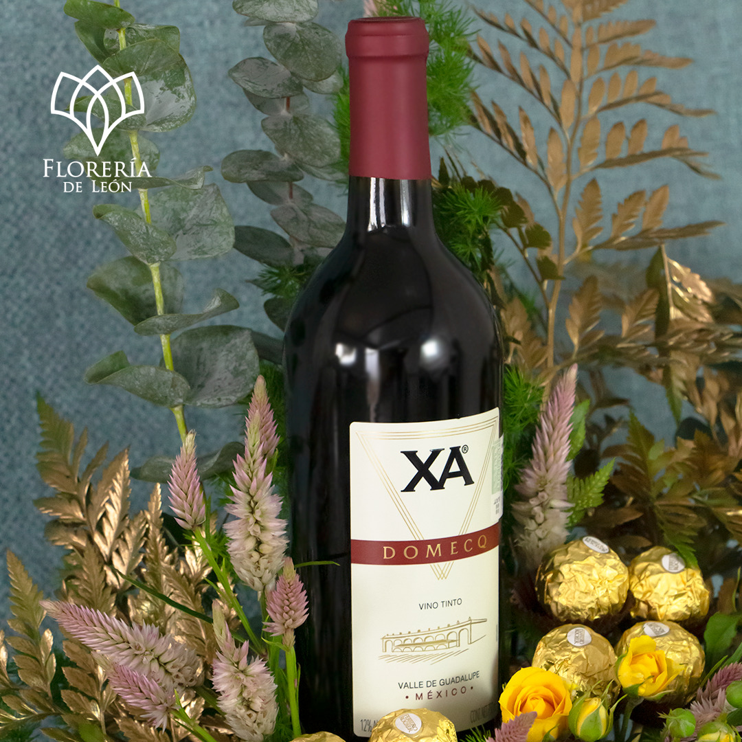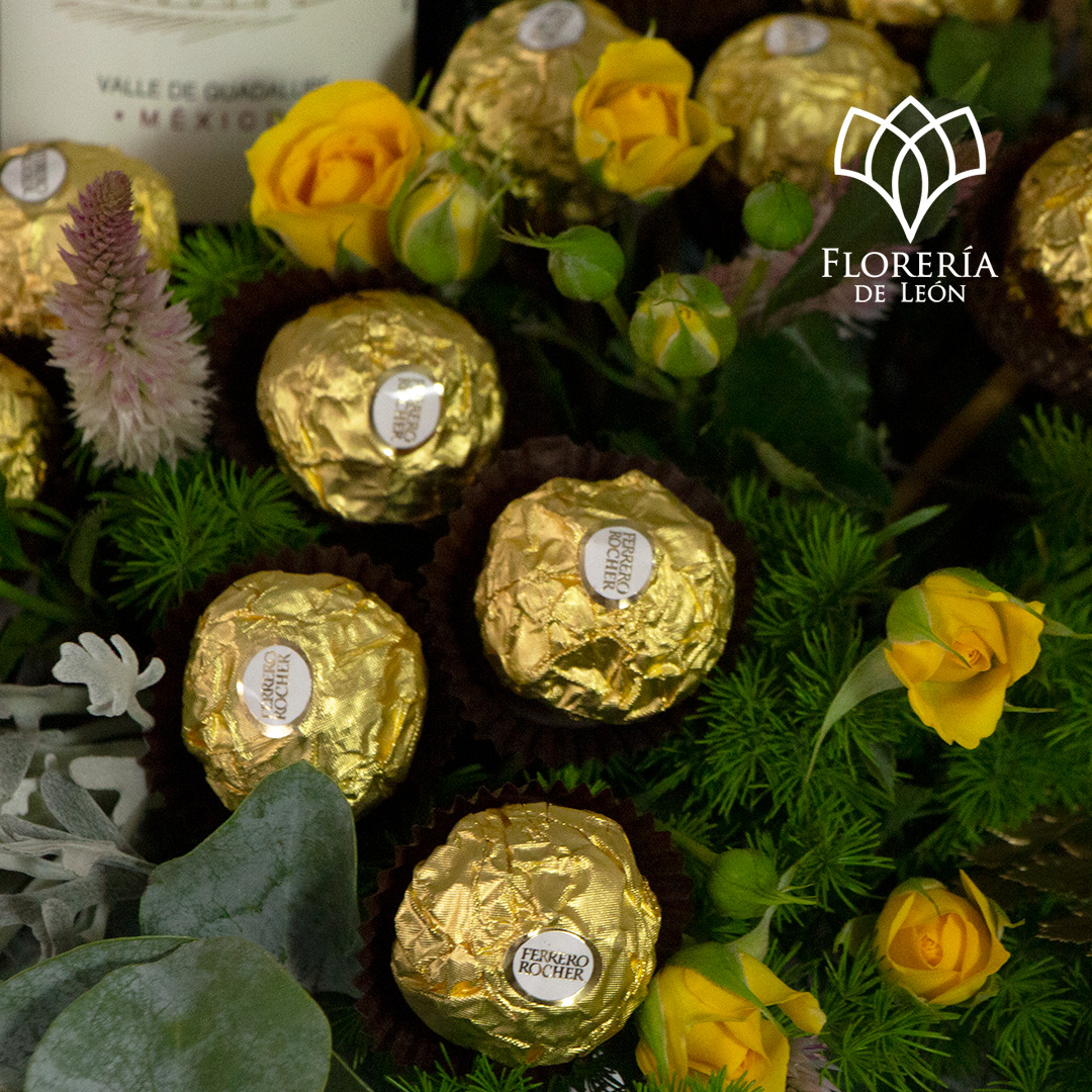 El mejor regalo para tus proveedores y mejores clientes es este bonito arreglo floral con vino tinto Domecq, chocolates Ferrero Rochér y follajes finos.