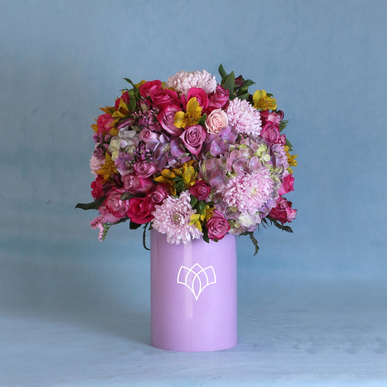 Caja cilindrica color lila de flores variadas en tonos morados. Envíos en León, Guanajuato y Celaya. Servicio a domicilio. Regalo para el día de las madres, de aniversario, cumpleaños, ceremonias, graduaciones, bodas, detalle, sopresa.