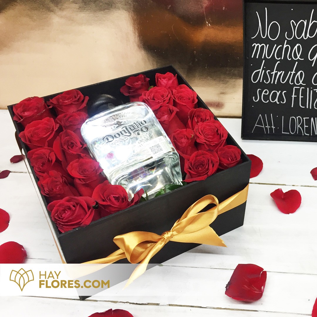 Distinguida caja con una botella de Don Julio 70 acompañada de 24 rosas rojas para resaltar el detalle. Esta es una opción unisex apropiada para cualquier celebración; cumpleaños, aniversario, ceremonias, graduaciones, detalles, sorpresas, etc.