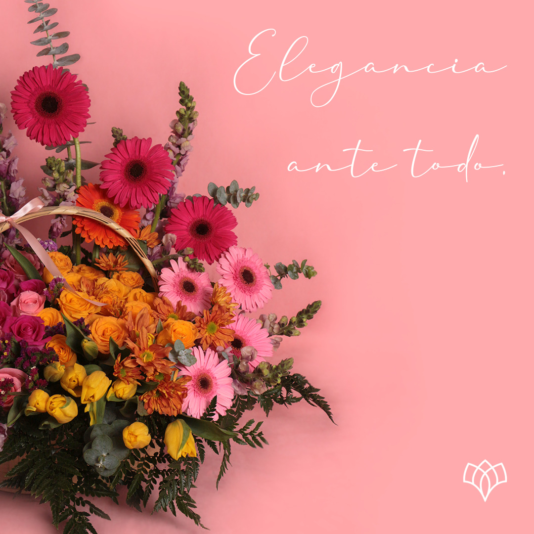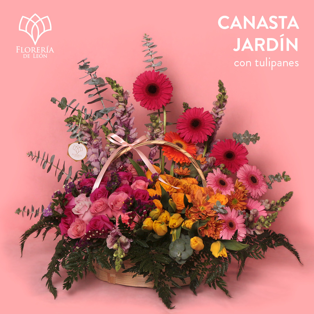 La canasta primaveral compuesta por flores frescas y finas: rosas tonos pastel, rosas anaranjadas, gerberas de diversas tonalidades, tulipanes y follajes finos.