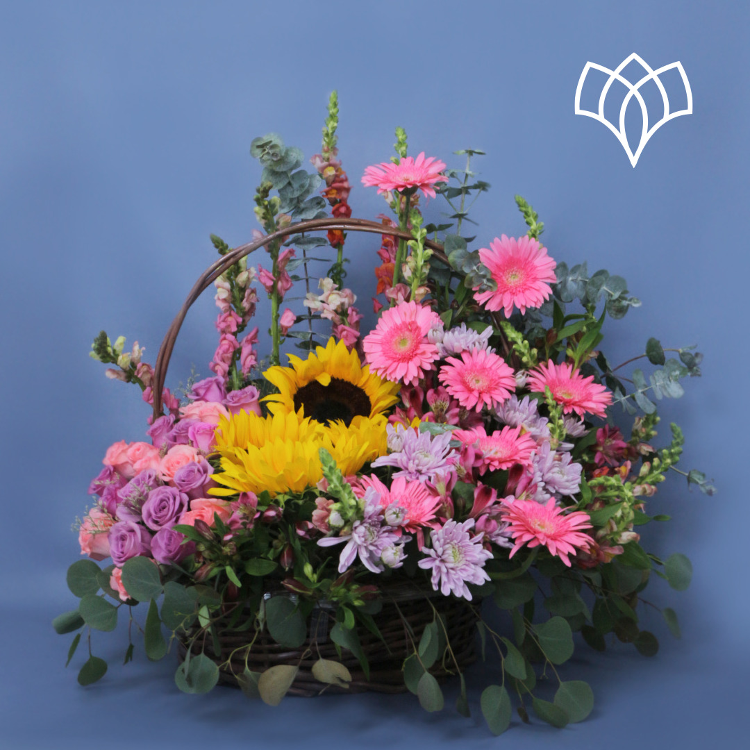 Esta es una distinguida canasta floral muy fresca. Compuesta con diferentes flores; Girasoles, rosas, astromelias, gerberas y follajes finos para complementar.