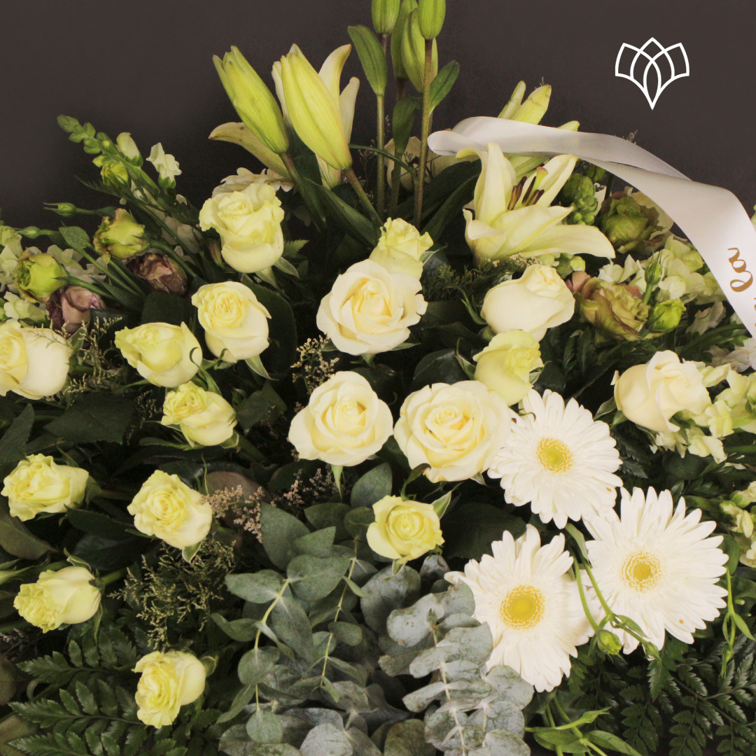 Cojín fúnebre con rosas, gerberas y lilis blancas, además de follajes finos.