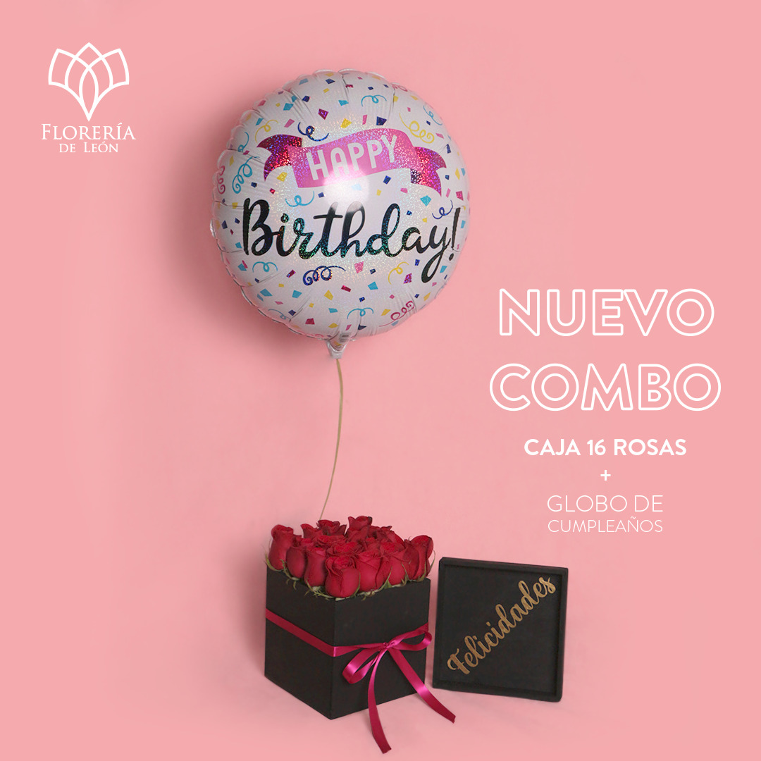 Perfecta y delicada caja de 16 rosas rojas con globo de cumpleaños.