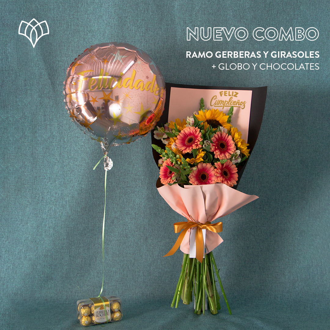 Este paquete incluye: Ramo de gerberas, globo de cumpleaños y caja de 16 chocolates Ferrero Rocher.