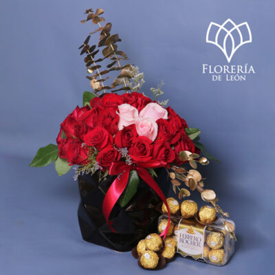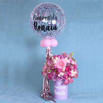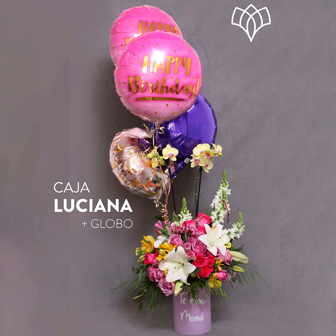 Bonita caja Luciana la cual contiene orquídeas y rosas, más 2 globos metálicos lisos y 2 globos de cumpleaños.