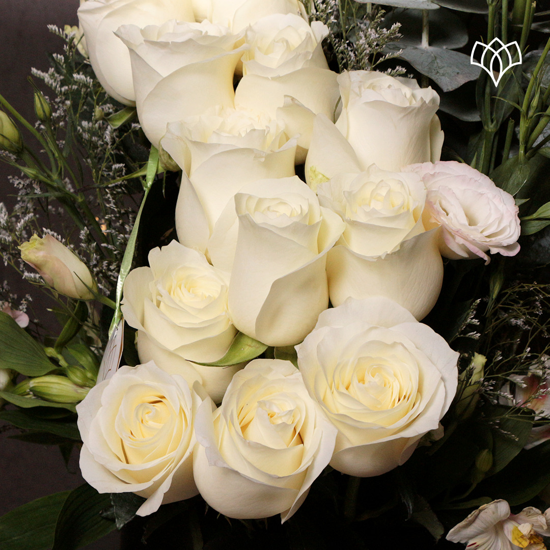 Una manera de recordar a los que más queremos que están en el cielo es  con este arreglo de 24 rosas blancas en forma de escalera y toques de lisianthus.