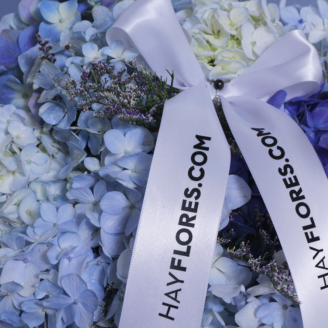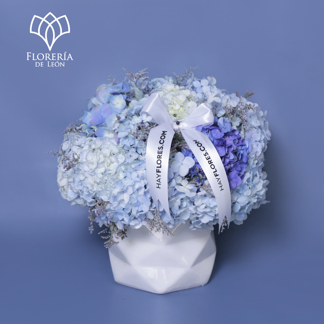 En un universo donde buscamos los pequeños pero importantes detalles de la vida te presentamos este selecto florero de cerámica geométrico con hortencias blancas con azul, acompañado de follaje fino y un listón.