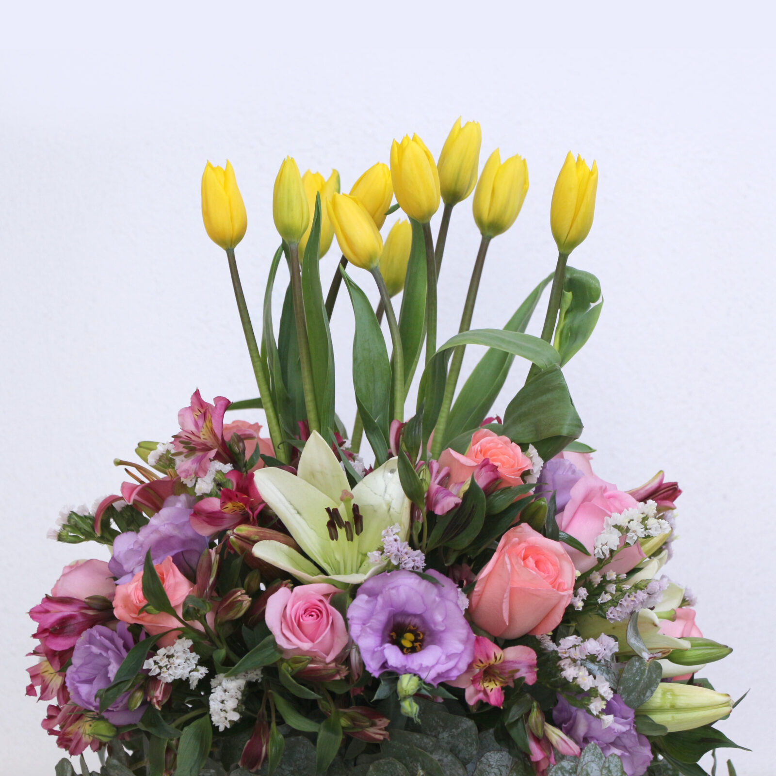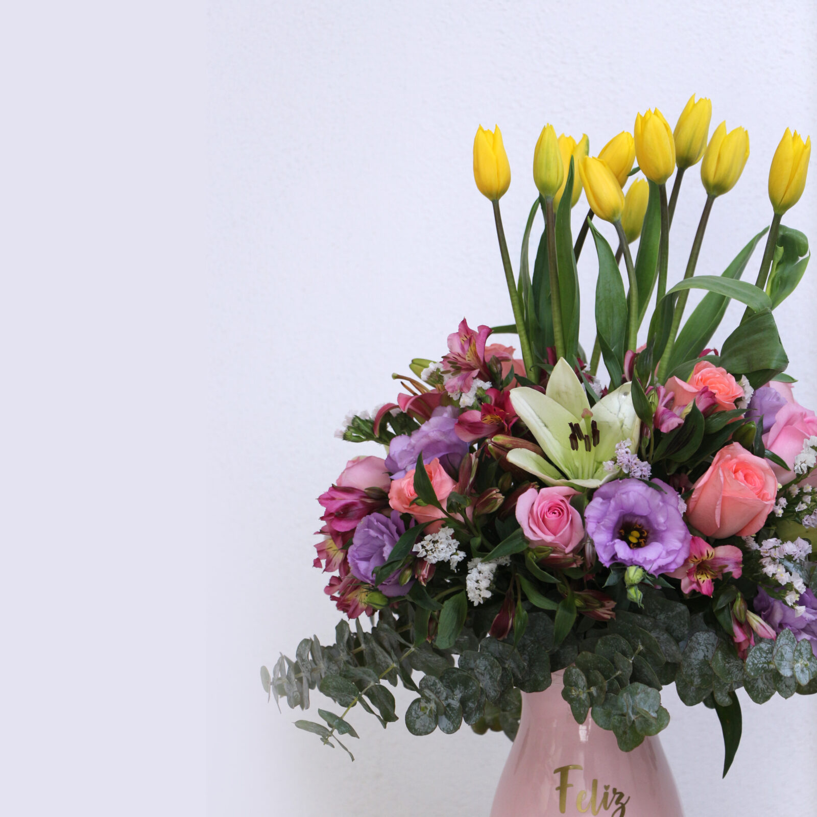 Florero de flor variada con rosas y tulipanes amarillos. Creado en una base de cerámica alta de color blanca con una selección de flores variadas las cuales incluyen tulipanes, rosas, margaritas, caspias, statis y follajes finos. Ideal para cumpleaños.