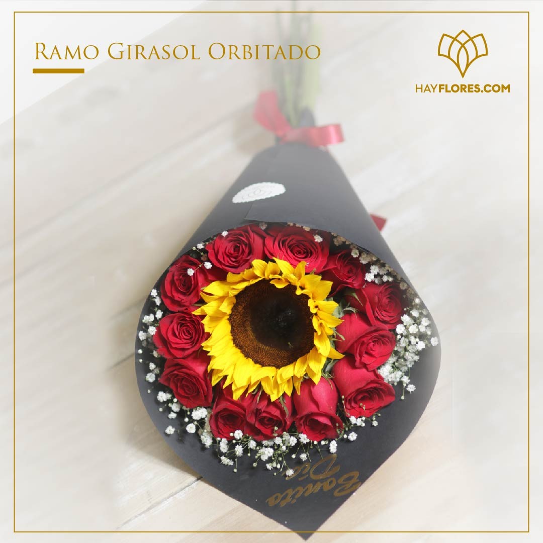 Ramo con rosas orbitando al rededor de un bello girasol.