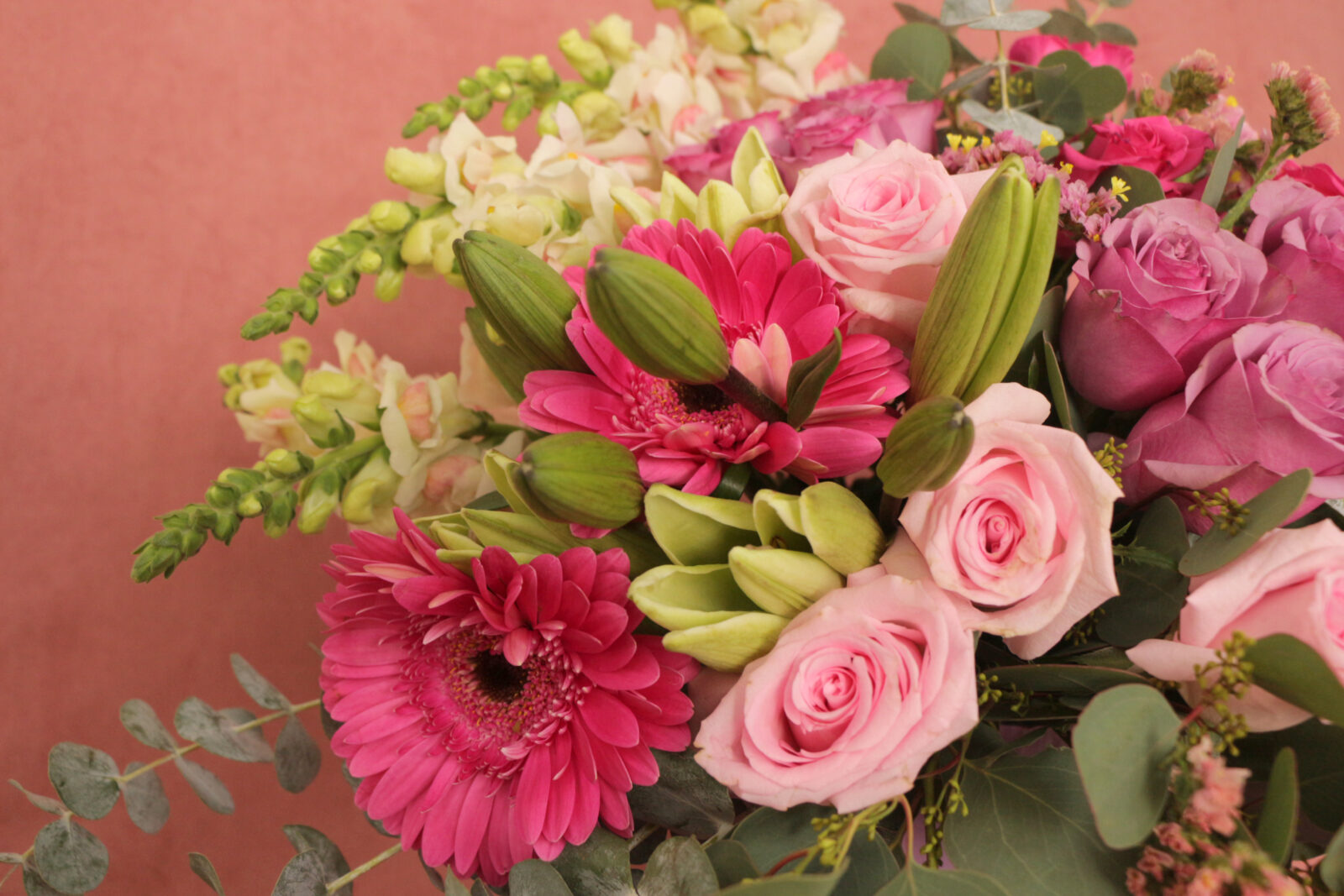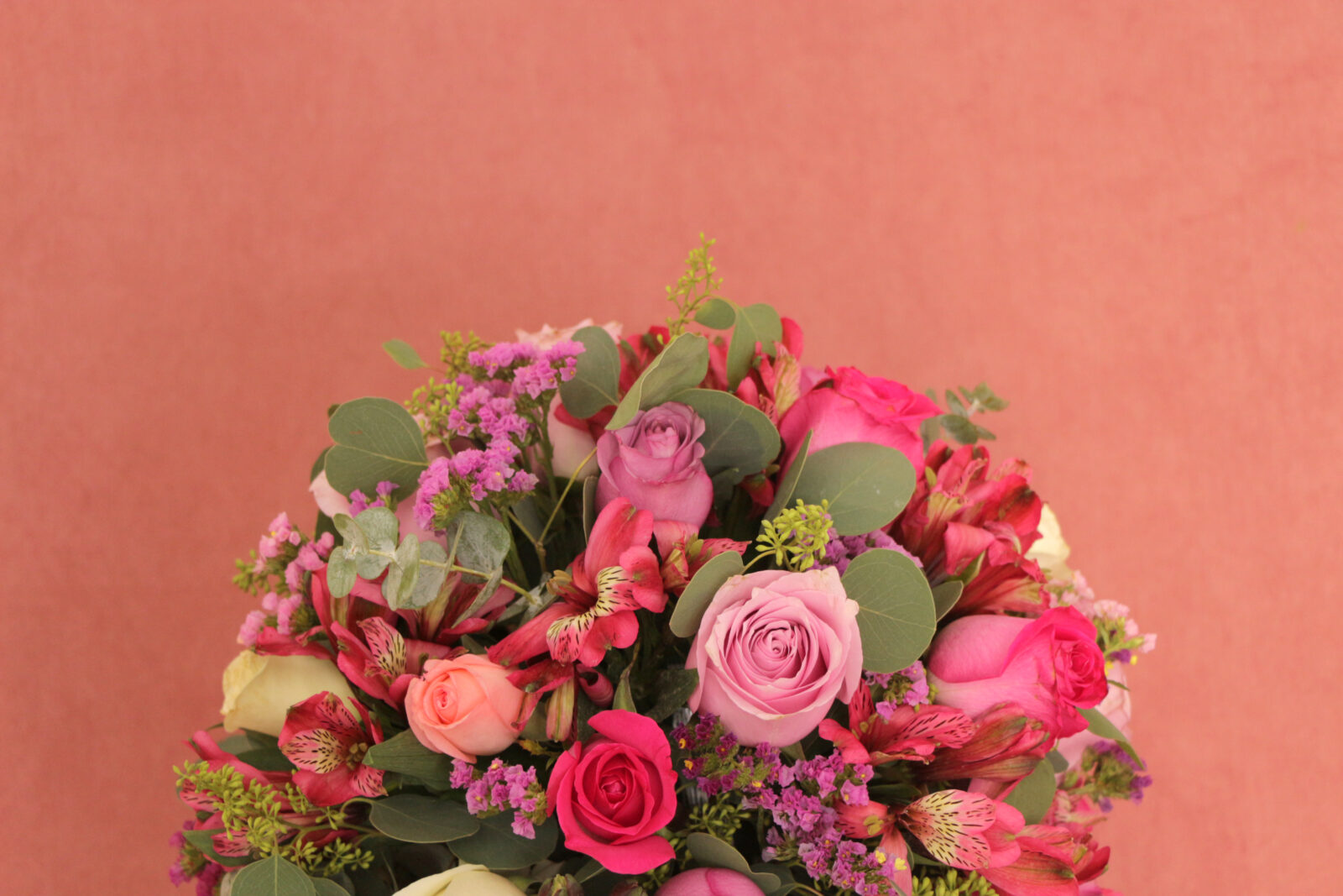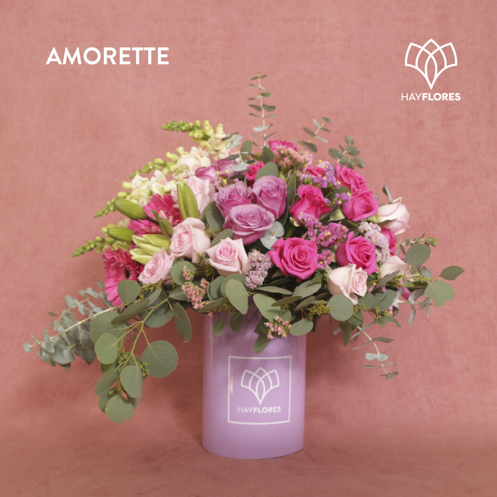 En una elegante caja cilíndrica con rosas, mini rosas, liciantus, follajes finos.