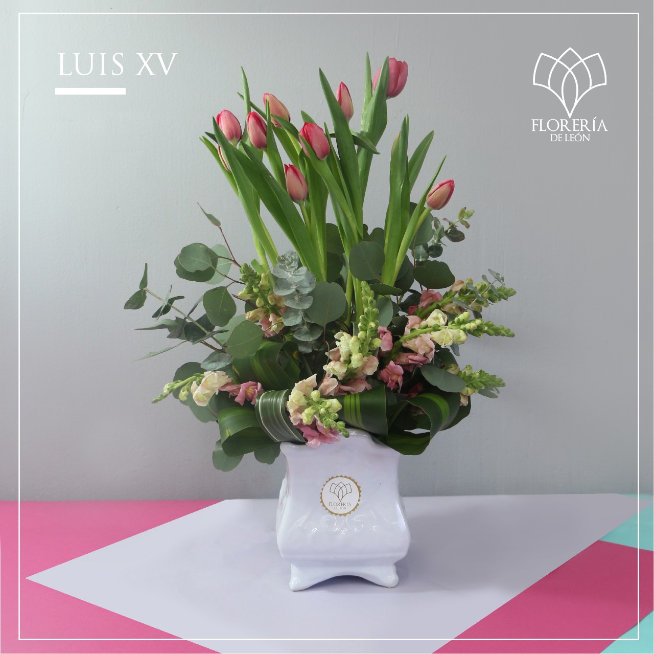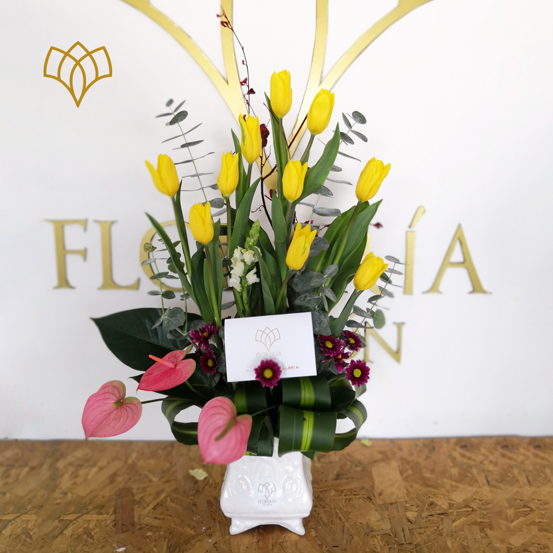 Arreglo floral en base de cerámica Luis XV con bonitos tulipanes. Envíos en León, Guanajuato y Celaya. Servicio a domicilio. Regalo para el día de las madres, aniversarios, cumpleaños, ceremonias, graduaciones, celebraciones, bautizos, bodas.