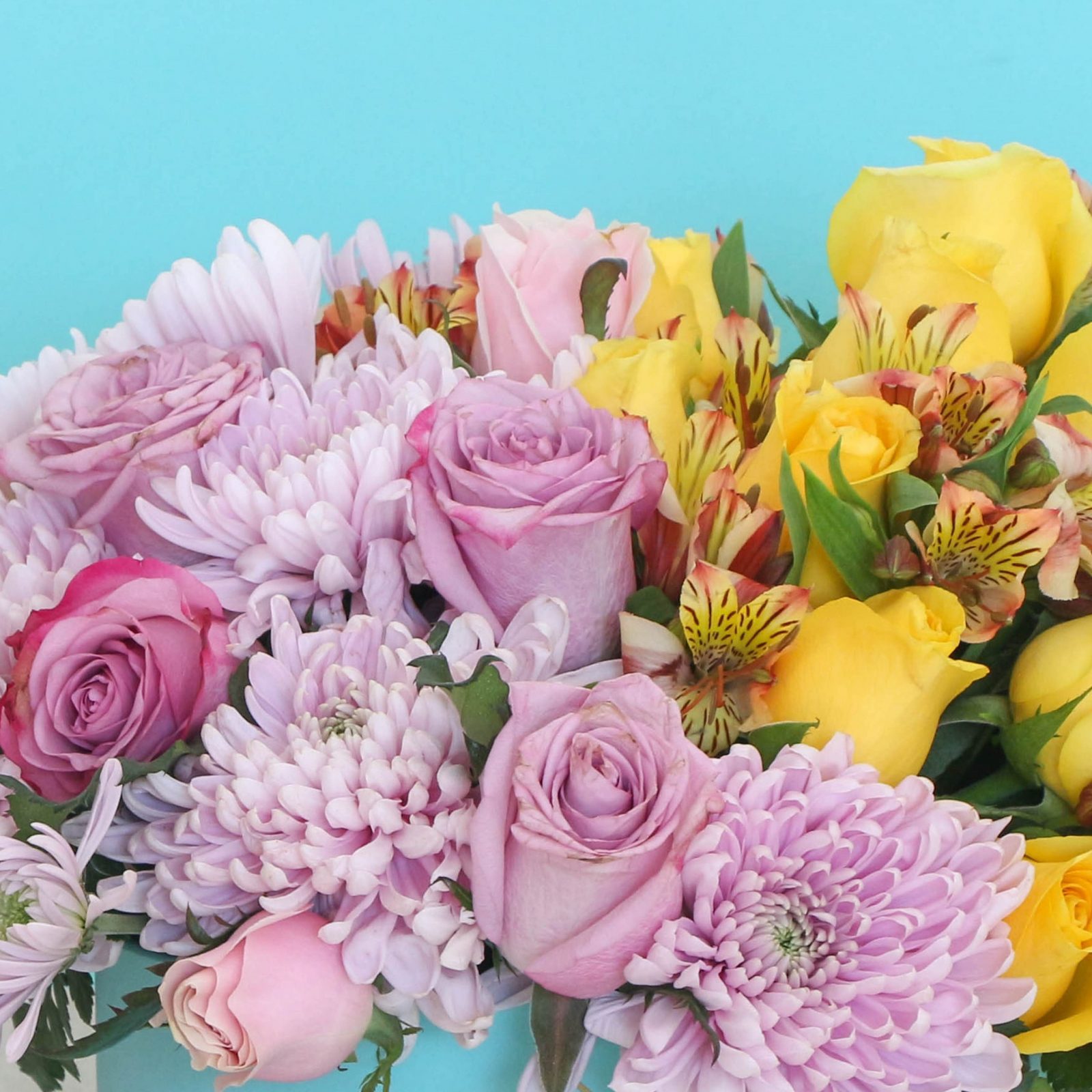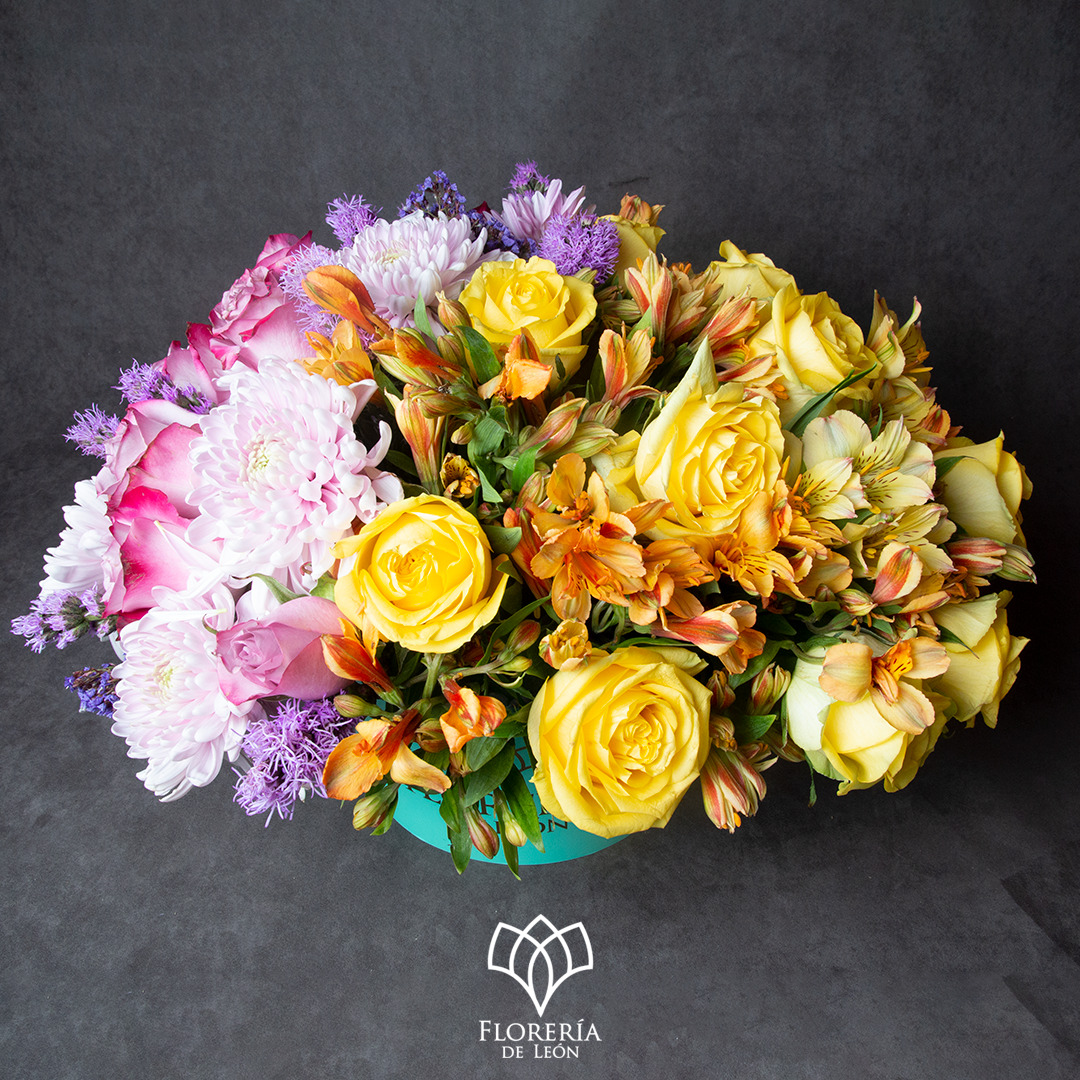 Hazla sentir como una princesa con esta bella caja de Rosas Moradas y amarillas con follajes finos.