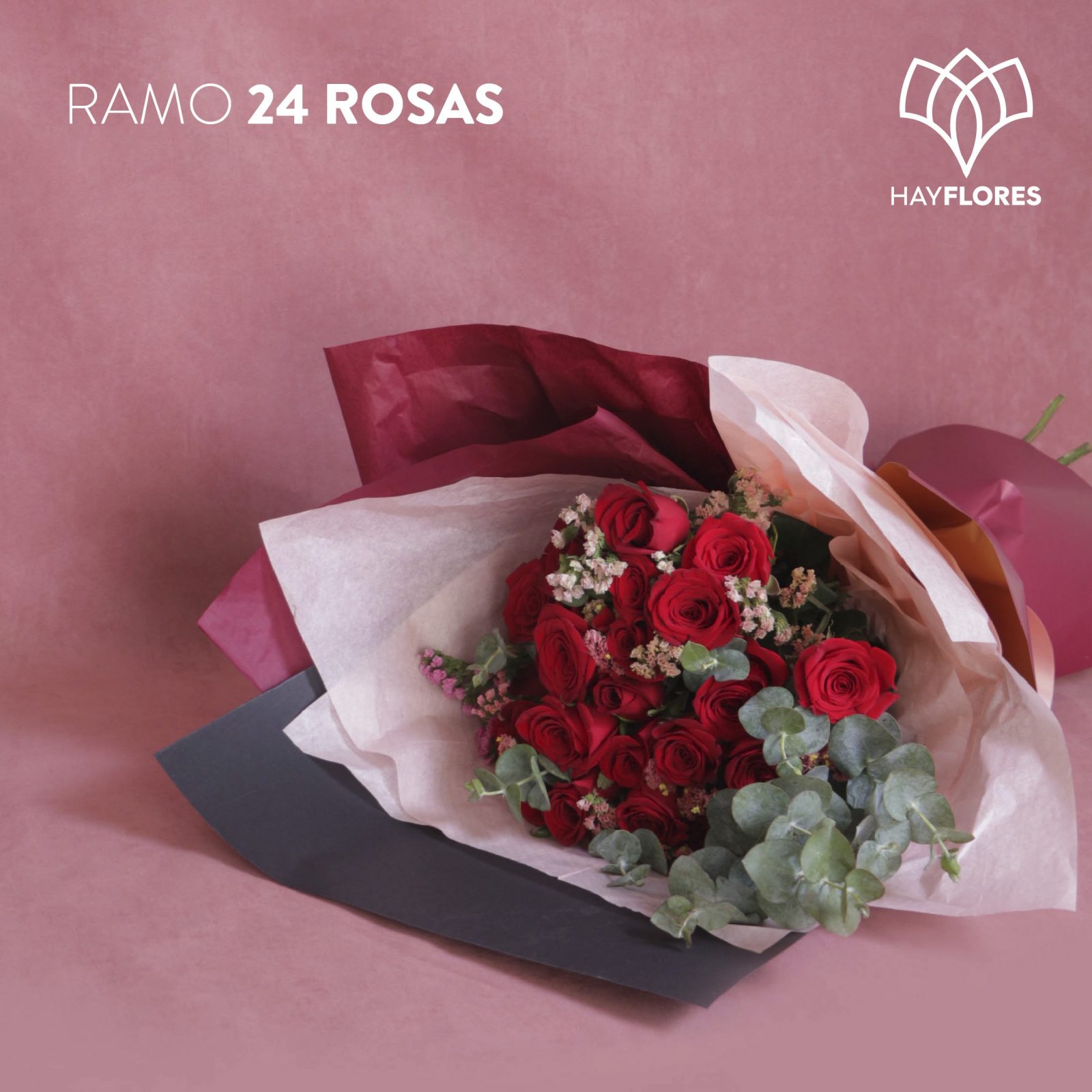 Ramo de 24 rosas rojas envueltas entre follaje y papeles finos.