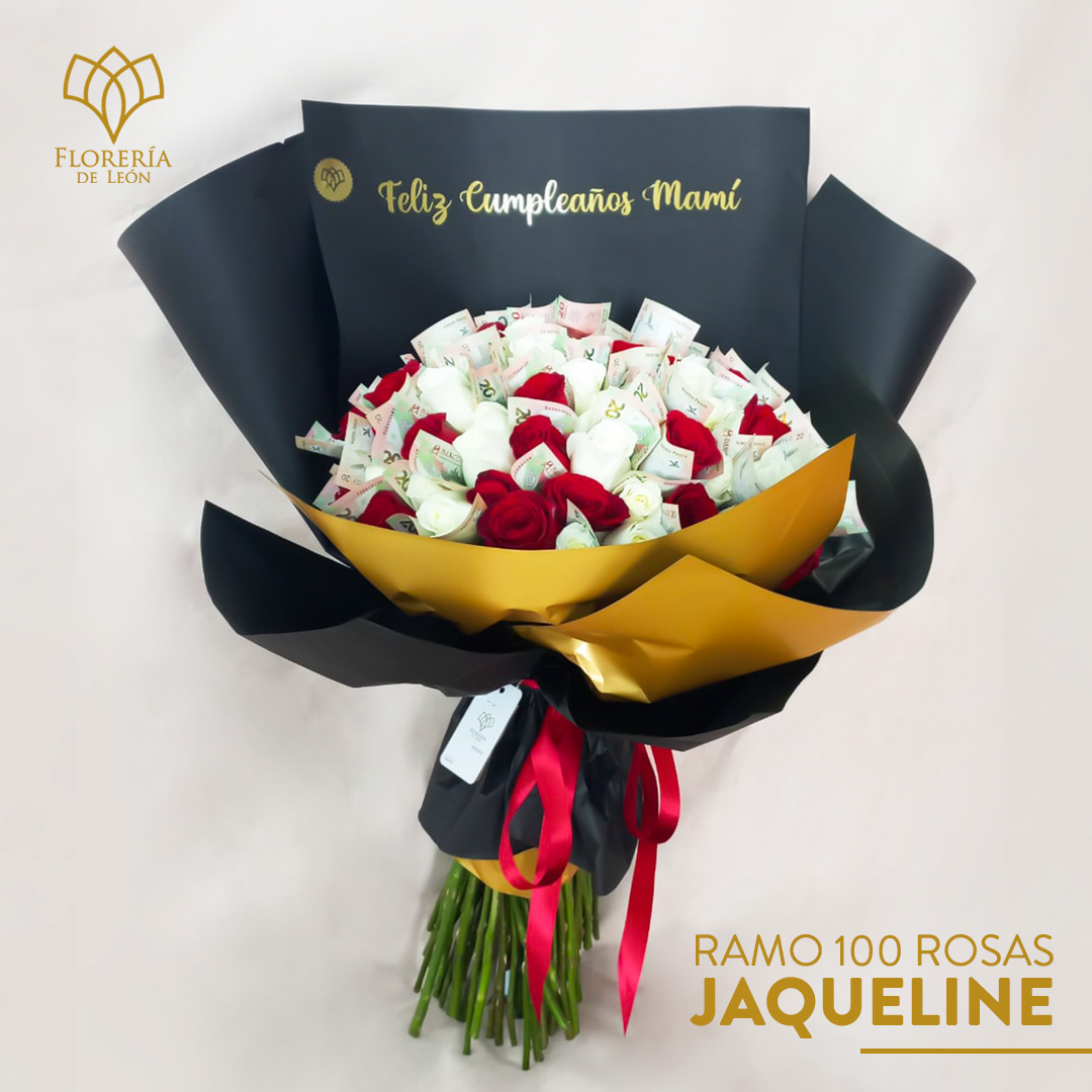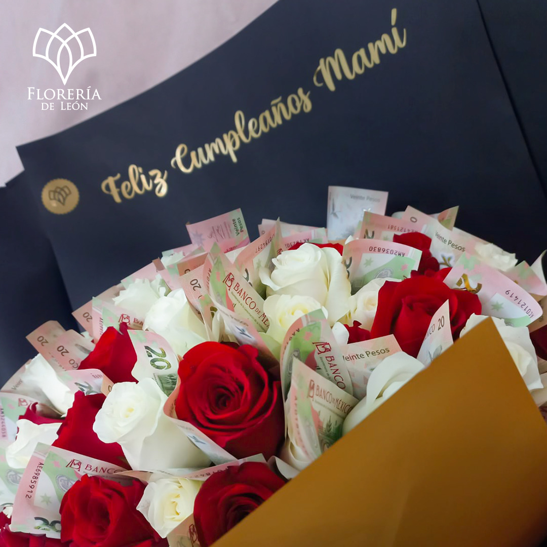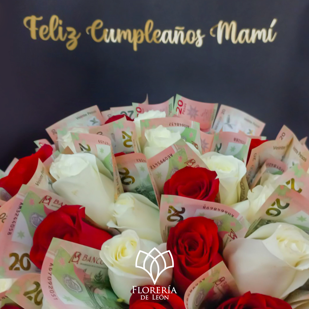 ¡Ay! Qué bonito sería un ramo de flores con DINERO en efectivo. Así es, los sueños más extravagantes se han quedado cortos al llegar a nuestras capaces manos. Estás son 100 rosas rojas y blancas acompañadas de $2000. Envíos en León, Guanajuato y Celaya. Servicio a domicilio. Regalo para el día de las madres, aniversarios, cumpleaños, ceremonias, graduaciones, celebraciones, bautizos, bodas. Incluye frase prediseñada o personalizada.