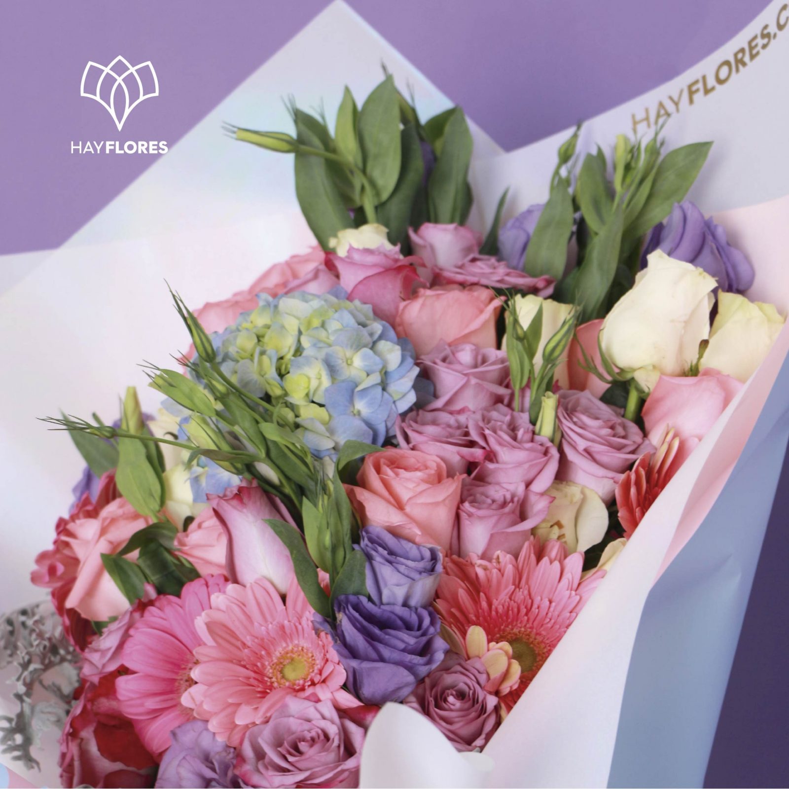 Ramo de rosas, hortencias, gerberas, lisianthus y follajes finos.