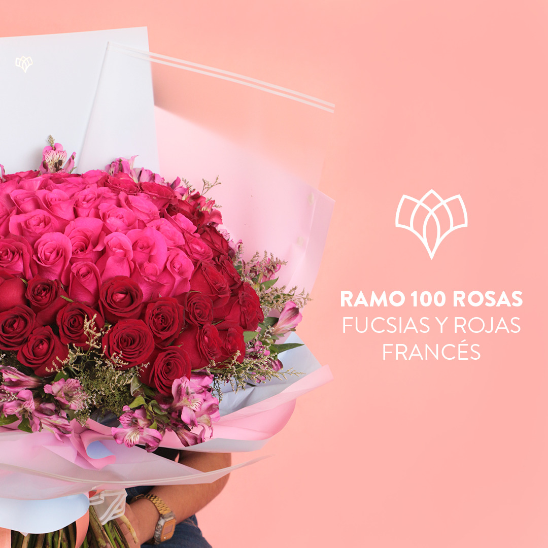 Basado en la expresión de la diversión, el ramo francés con 100 rosas rojas busca una composición casi perfecta, al formar un medio circulo con base de lirios y naturaleza para complementar. Envuelto en un arreglo con tonos fucsia en combinación de las flores. Apropiado para eventos de etiqueta, celebrar aniversarios, generar conmoción en graduaciones y provocar lágrimas en cumpleaños.