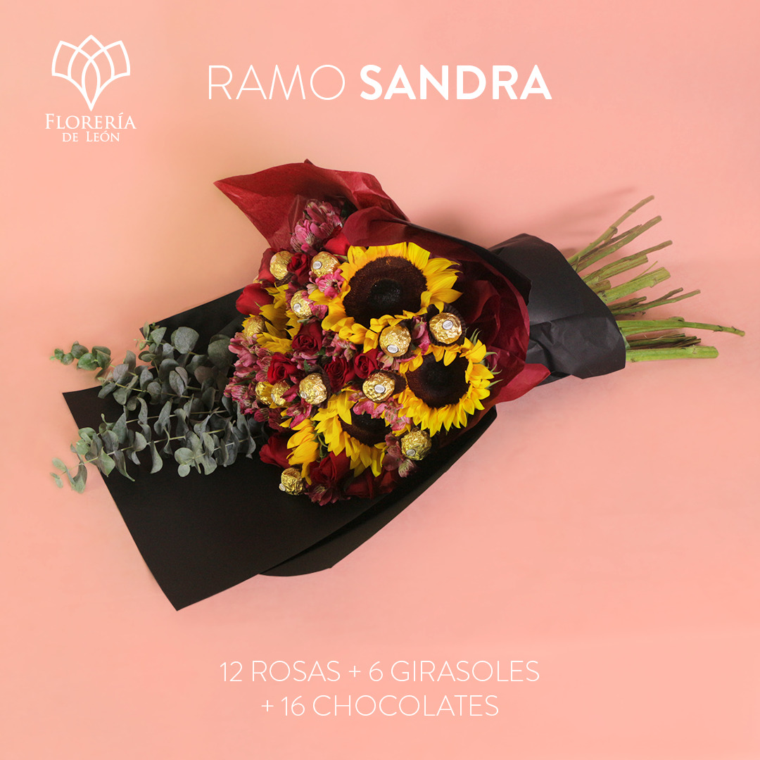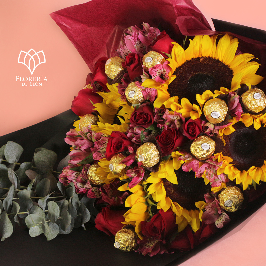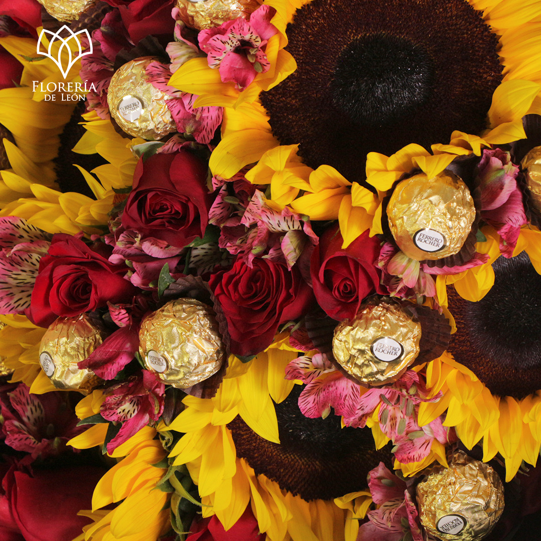 Bonito ramo de 12 rosas, 6 girasoles y 16 chocolates Ferrero.