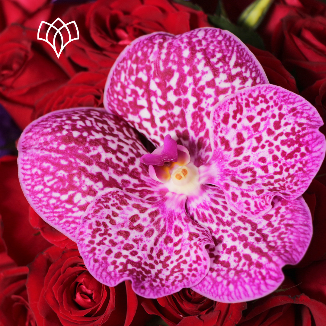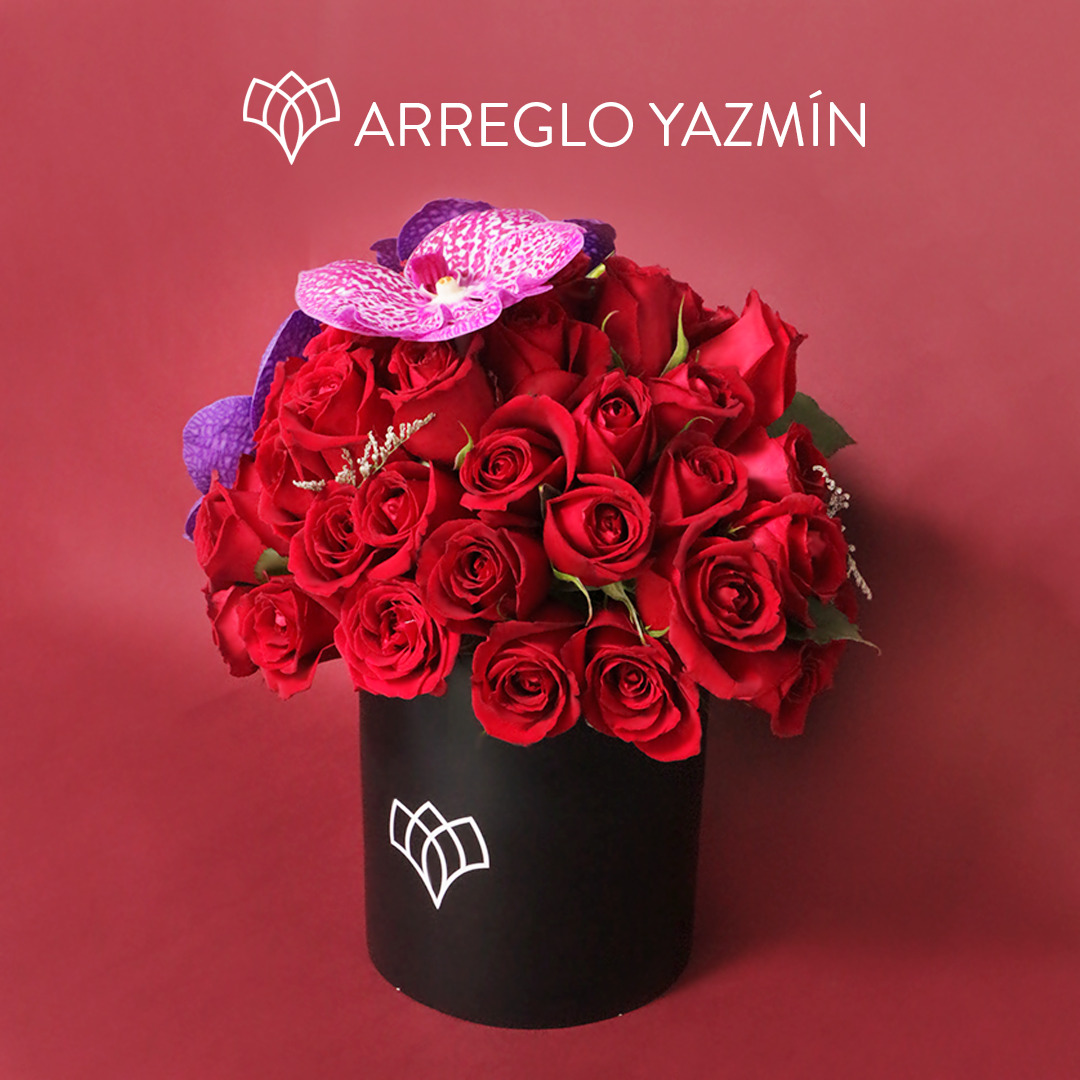 Elegante arreglo de 24 rosas rojas con 3 orquídeas.