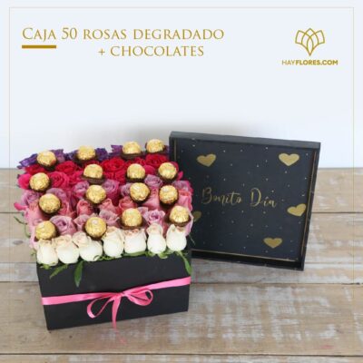 Caja 50 Rosas en Degradado C/Chocolates