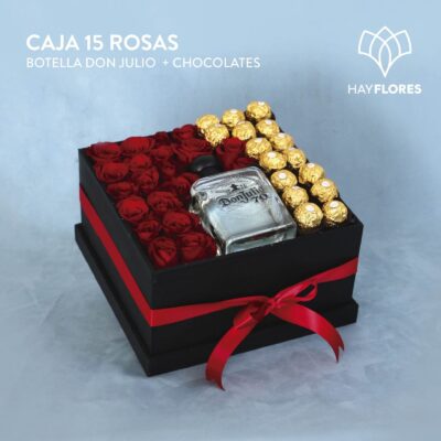 Caja con rosas + Botella y chocolates